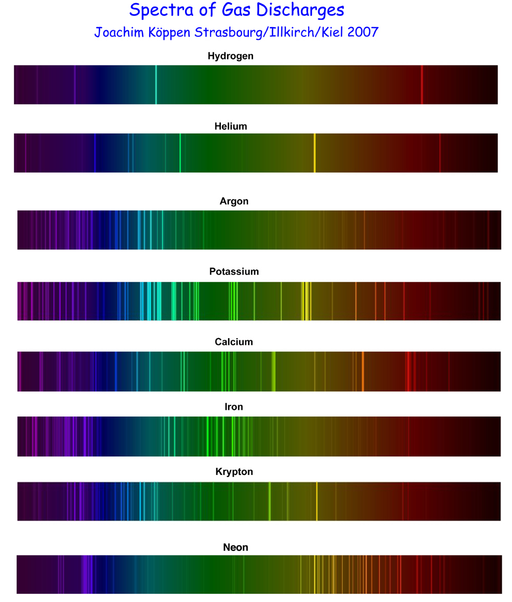 - Match the emission-line "fingerprints" that you observed with samples at right, thus identifying the gas in the lamp.