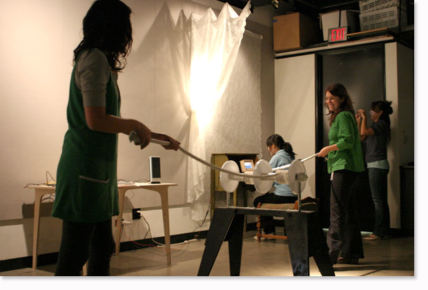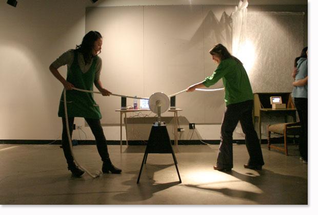 The intention behind my Push & Pull knob project for Productive Interaction was to physically put into motion the mental struggle that we all battle with in our daily lives, how to balance work and play. I wanted to use a tug of war metaphor to show that we are constantly being pulled in two directions and it's difficult to maintain a balance. In the piece when one person pulls the rope one way it plays a combination of "work" sounds, cars starting, printers printing, people mumbling. When the rope is pulled the other direction it plays quiet, peaceful sounds, birds chirping, chimes, ocean waves. I wanted the sounds to be ambiguous so that although they were recognizable they were still abstract enough that the meaning could be left to the listener, and their own personal experience about what trying to maintain that balance meant to them.
