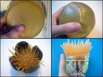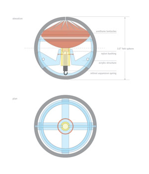 I've always enjoyed the aesthetics of engineering. Here are some parts of the forms I've been working on. A spring to open and close an RFID dispersing shell form. A 3D model Peter built for the gummy toad. And a draft of the mechanisms for a hand held anemone object.