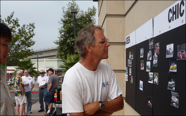 Inspired by the interview with Rex Parker, I set out to discover how car enthusiasts rate car design. Every Saturday morning, a group of car enthusiasts congregate at the UA lot and admire each other's cars. I took a large black board and hung it at the UA theatre in La Canada. I asked enthusiasts to put pictures of cars on the board containing a scale of 1-10, 1 being geek and 10 being chic. Included in the rating system are hybrids, hydrogen, full EV, I.C.E. cars, concept cars, super cars, and known sports cars. The importance of this was to start a dialogue, not just ranking of the black board. Enthusiasts liked quirky cars, but when asked if they would buy it were hesitant. The shape they preferred depended on their personal experiences. Ben, a retired Air Force pilot, favors cars that more resembled streamlined jets. Hybrid cars and electric cars were generally labeled near the geek area. Overall interest towards hybrid and EV car design was not favorable. These insights further cemented my understanding of the disconnect between enthusiasts and hybrid/electric cars. Insights gathered from this probe inspired the feature article BUILD THIS CAR OR DIE.